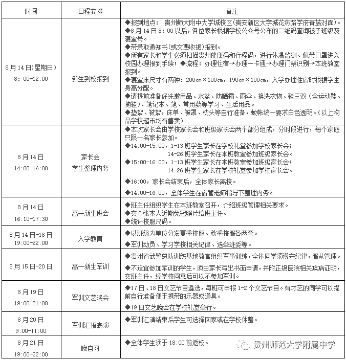 ➤军训及返校时间8月14日至20日军训,军训结束学生返家。8月21日下午6点前返校,8月22日正式上课。