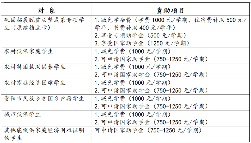 如果你的家庭户籍所在地为贵阳市民族乡和贫困乡,你可以享受到这项资助。具体为:南明区小碧乡,花溪区孟关乡,花溪区马铃乡,花溪区黔陶乡,花溪区高坡乡,乌当区新堡乡,乌当区偏坡乡,白云区牛场乡,白云区都拉乡,清镇市王庄乡,清镇市麦格乡,清镇市流长乡,清镇市暗流乡,修文县大石乡,修文县小箐乡,修文县洒坪乡,修文县六屯乡,开阳县禾丰乡,开阳县高寨乡,开阳县南江乡,开阳县宅吉乡,息烽县青山乡,息烽县石硐乡,息烽县九庄镇,息烽县鹿窝乡,息烽县流长乡,息烽县养龙司乡。你需要准备的材料有: