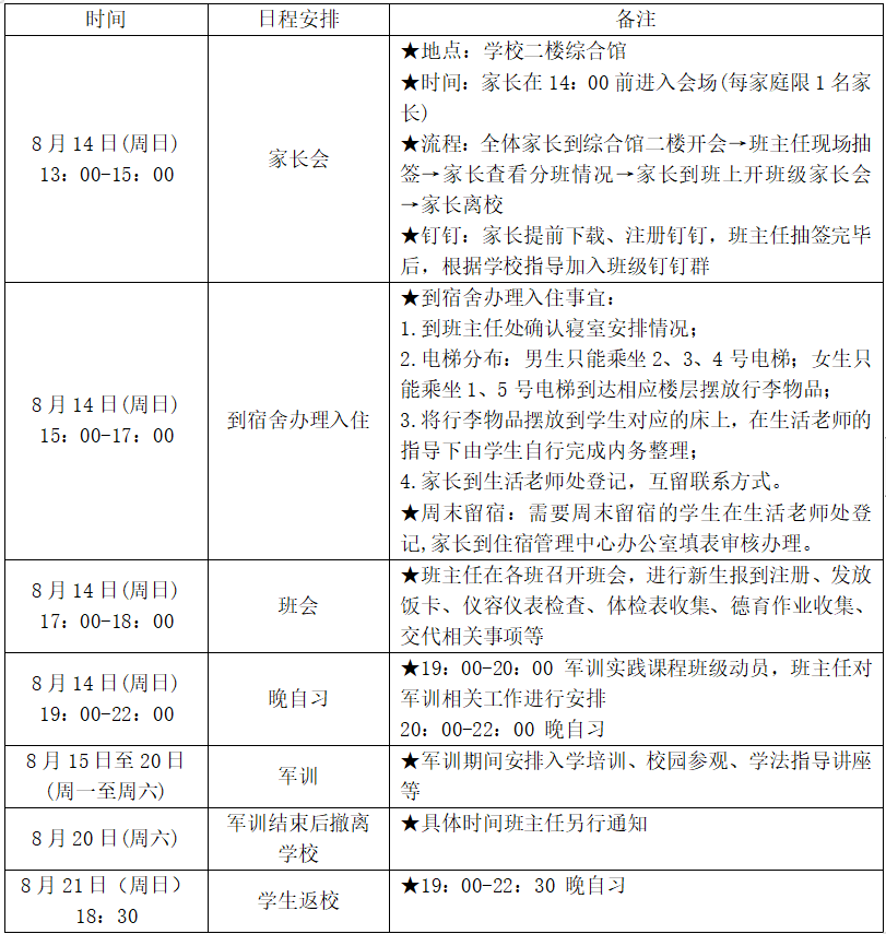 8月14日上午8:30:新生了解分班结果,进班级报到;检查仪容仪表;交体检表;新生参加“入格教育”(二),主题为“融入高中新集体”、“悦纳高中新环境”;军训动员及相关准备;
