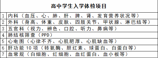 注:该校为寄宿制学校,学生必须到符合规定的医疗机构进行体检。其他项目应根据国家相关法律、法规、规定所要求开展的检查项目或根据地方具体情况,进行适当增补,涉及实验室和影像学检查必须在医疗机构内完成。