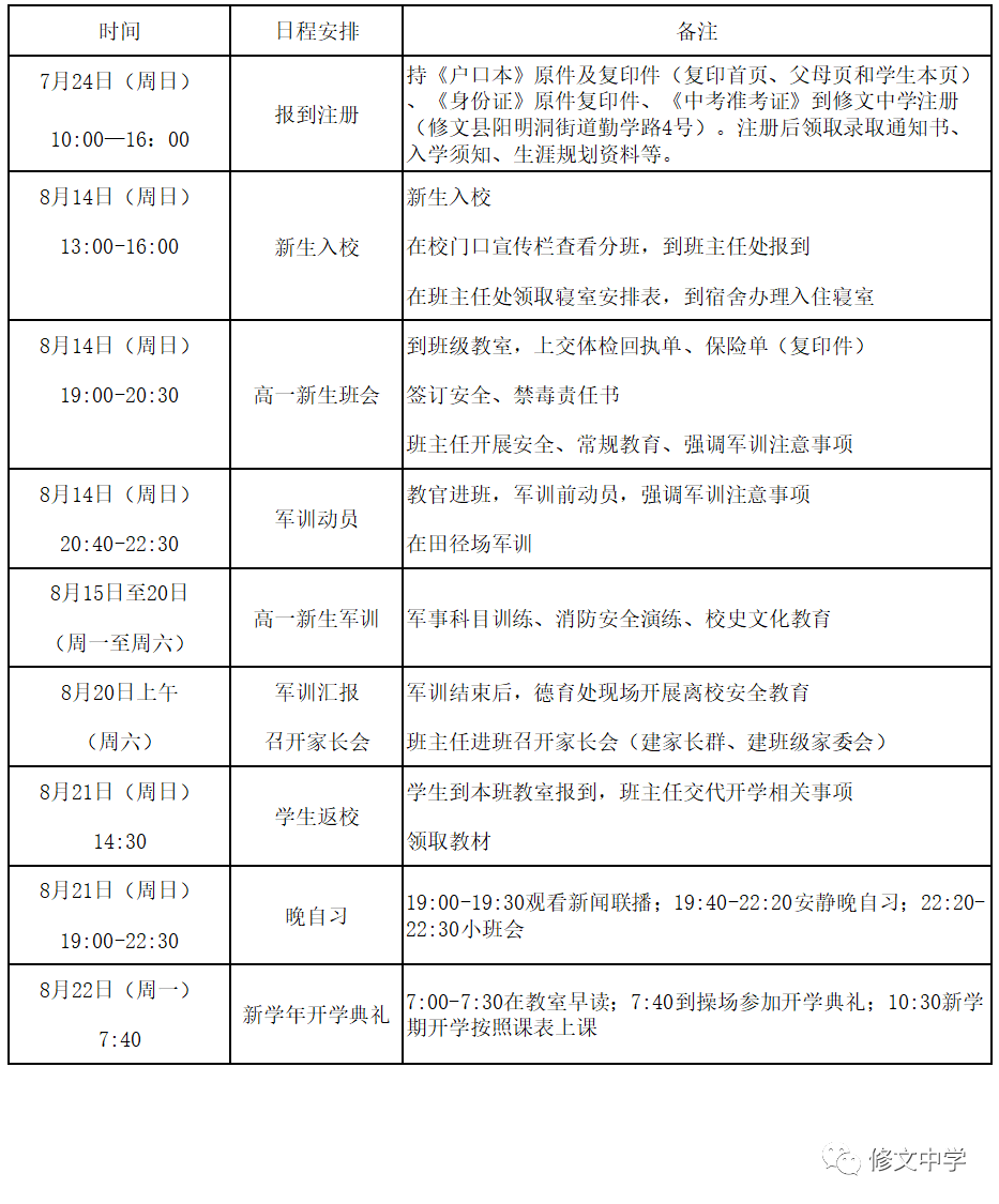 一、报到时间及日程安排报到时间:7月29日(星期五)9:00-12:00。开学时间:8月14日(星期天)。8月14日14:00-17:00:学生从新校门(北门)入校,在笃雅楼操场查看军训分组、教室、寝室情况,到寝室放行李,打扫寝室卫生;到教室找班主任,打扫教室卫生。8月14日19:00-20:30:(高一新生班会)班主任组织学生回教室上交体检回执单、保险单(复印件)、手机管理承诺书、安全、禁毒承诺书等资料。8月14日20:40-22:30:(军训动员会)教官进教室做军训动员,随后田径场集合军训(视天气而定)。8月15日-8月20日:军训。详见军训课程表。8月20日(星期六)上午8:30-12:00:(军训会操安全教育新生家长会)军训会操结束后学生在田径场开展离校返家安全教育,家长进班召开家长会。8月21日(星期天)下午16:00返校,按照课表开展学习活动。二、报到地点修文一中(笃雅楼大厅)。三、报到准备资料请带上户口本原件及复印件(复印首页、父母页和学生页,有身份证的同学还需带上身份证原件及复印件)。四、开学前的准备学生须自带行李及个人学习、生活用品等。为了规范管理,作统一要求:床单、被套、枕套开学报到时,按照学校规定的花色和型号自行选购;其余的牙膏、牙刷、温水瓶等生活必需品自备。垫絮、盖絮、枕芯等按照学校宿舍床的规格自备。附:学生用品规格床位:长2米,宽90厘米。床单、被套颜色:浅蓝色,棉絮:4—5斤左右,不要太厚。男生准备:牙刷、牙缸、牙膏、肥皂香皂各一块;2个盆(一个洗脸,一个洗脚);两块毛巾(一块脸帕一块脚帕);一个保温瓶;一瓶洗发水。女生准备:牙刷、牙缸、牙膏、肥皂香皂各一块;3个盆(一个洗脸,一个洗脚,一个洗澡);三块毛巾(一块脸帕,一块脚帕,一块澡帕);一个保温瓶;一瓶洗发水。鞋子:三双;一双运动鞋,一双休闲鞋,一双拖鞋。袜子:2双。行李箱规格:长70公分左右,宽40公分左右,高30公分左右。家长按照以上规格,根据学校提供的图片颜色及花纹提前订做,建议家长为孩子准备2套,以备换洗。五、体检与保险1.全体学生务必于14日返校前自行前往修文百信医院体检,返校后将体检回执单交班主任处。体检当日需空腹憋尿。2.开学前自行购买学生保险(建议到正规国有保险公司购买,如中国人寿)。六、相关费用1.学费380元,住宿费250元,书费根据发放据实收取。(以上费用待学校通知后,家长通过扫描微信二维码在贵州银行缴费平台交费)。2.生活费:家长通过扫描微信二维码在贵州银行缴费平台进行缴费。第一个月统一交生活费400元;开学后在班主任处领取饭卡,每张饭卡需10元卡费(现金),领卡时统一由班主任代收。特别说明:修文一中毕业的同学不用再重复交10元的卡费;卡上还有超过400元生活费的,本月也不用再交。报到时统一在班主任处领取饭卡。七、助学政策1.贵阳市民族乡、贫困乡(镇)学生免学费,参照《贵阳市民族乡和贫困县(镇)分布情况表》,按相关文件规定免除学费。修文县贫困乡(镇)是:大石乡、小箐镇、六屯镇、洒坪镇;需提供资料:◆户口本原件审核;◆交户口本、身份证复印件;◆户口本复印件为户口本首页和学生本人页在一张A4纸;2.巩固脱贫攻坚成果专项学生资助原建档立卡贫困家庭学生按照国家政策规定,学生报名注册时直接免学费、免教科书费、免住宿费;开学后享受扶贫专项助学金和国家助学金。3.其他免学费补助政策家庭经济困难残疾学生、农村低保家庭学生、农村特困救助供养学生(孤儿)、城市低保家庭学生,按照国家政策,学生报名注册缴费时直接免交学费入学。提供资料:◆家庭经济困难残疾学生提供残疾证原件及复印件、学生身份证复印件各一份;◆低保家庭学生提供低保证原件及复印件、学生身份证各一份;◆农村特困救助供养(孤儿)学生提供父母死亡证明及学生身份证复印件一份。4.其他助学项目贫困家庭学生根据家庭经济困难情况,开学初可以申请国家助学金、巩固拓展脱贫攻坚成果专项学生资助、小平助学金、免学费补助、免除书费和住宿费及校服费等项目。详细事宜开学后由班主任另行通知。八、军训服军训服请大家在8月14日前自行购买好,杜绝购买和使用现行军服及伪制品。九、疫情防控要求1.根据最新疫情防控要求,如果在入校前14天,新生或同居人员出入过外省,或出入过疫情高危地区,需按相关规定向社区报备接受隔离观察后才能入校。2.报到前请自测体温,体温≥37.3℃者不得入校,及早就医接受进一步检测。3.所有新生及进校家长须扫场所码,出现异常的家长不得入校。4.因疫情防控需要,尽量减少人员聚集,每生只能安排一名家长(监护人)陪同,报到时请家长与学生全程佩戴口罩。