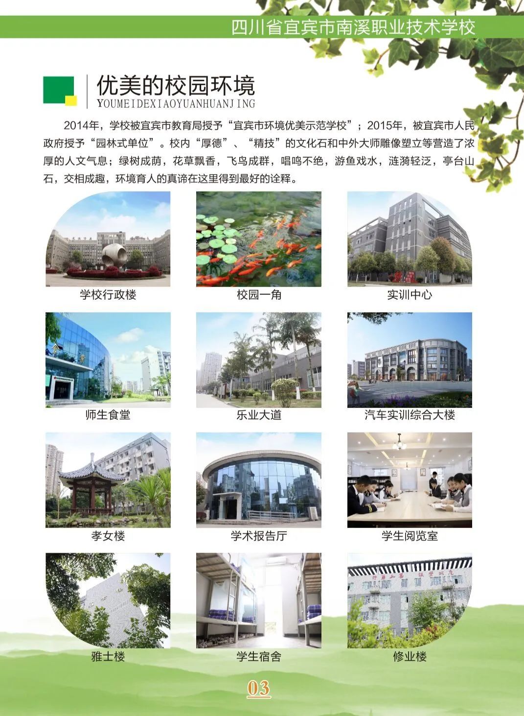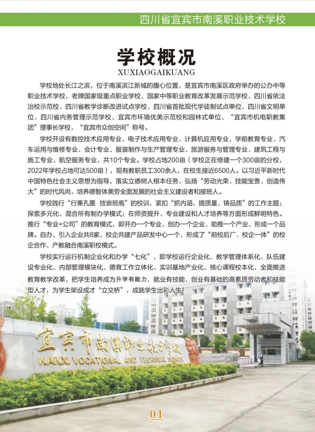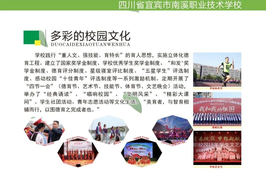 宜宾市南溪职业技术学校是国家级重点职业公办学校,学校地处长江之滨,位于南溪滨江新城的腹心位置。是宜宾市南溪区政府举办的公办中等职业技术学校,老牌国家级重点职业学校,国家中等职业教育改革发展示范学校、四川省依法治校示范校、四川省教学诊断改进试点学校、四川省首批现代学徒制试点单位、四川省文明单位、四川省内务管理示范学校、宜宾市环境优美示范校和园林式单位等。