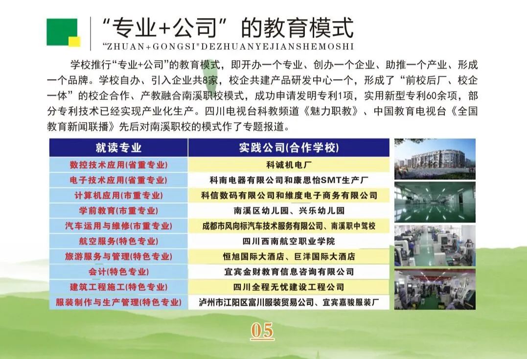 “专业+公司”的教育模式。学校推行“专业+公司”的教育模式,即开办一个专业、创办一个企业、助推一个产业、形成一个品牌。学校自办、引入企业共8家,校企共建产品研发中心一个,形成了“前校后厂、校企一体”的校企合作。产教融合南溪职校模式,成功申请发明专利1项,实用新型专利60与项,部分专利技术已经实现产业化生产。