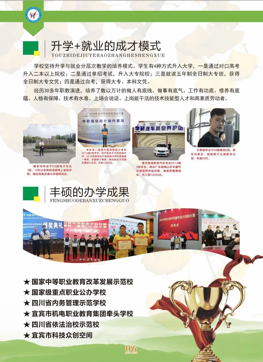 优美的校园环境这里有优美的花园式校园环境,学校2014年被宜宾市教育局授予“宜宾市环境优美示范学校”;2015年被宜宾市人民政府授予“园林式单位”。校内 “厚德”、“精技”的文化石和中外大师雕像塑立等营造了浓厚的人文气息;绿树成荫,花草飘香,飞鸟成群,唱鸣不绝,游鱼戏水,亭台山石,交相成趣,环境育人的真谛在这里得到最好的诠释。