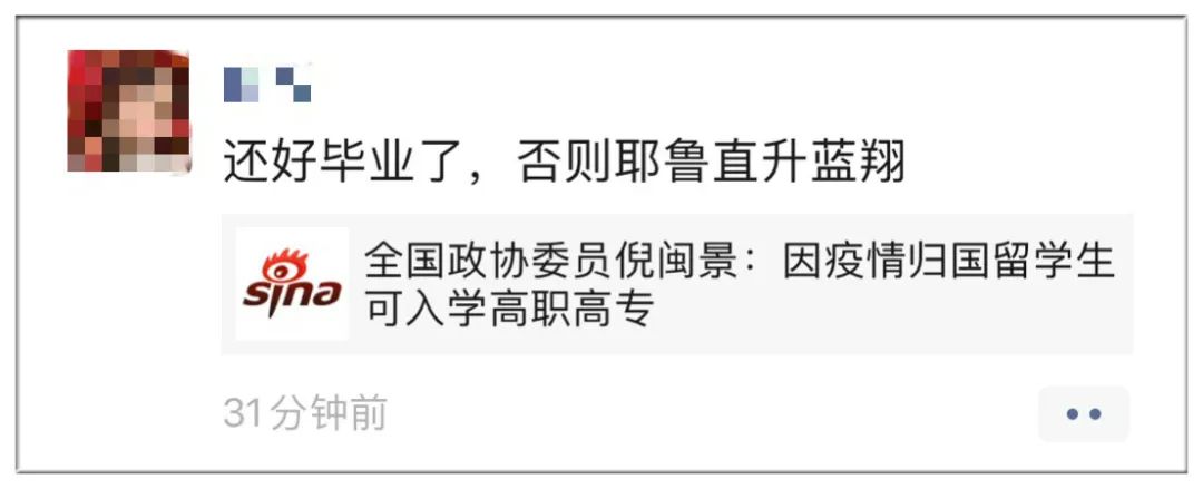 对这项新提议的吐槽,就是今天推送的全部内容了,但是对合理政策的呼声却迟迟没有结束,一项合理的政策也迟迟没有出台。希望这半年流行的只是新冠,而不是懒政的一刀切和某些键盘侠突如其来的优越感。一部被国家点名表扬的电影里,曾经有一句经典台词:中国护照不一定能够把你带到世界任何一个地方,但是它能把你从任何一个地方接回来。希望这句台词能尽快照进现实吧。1国内的疫情虽然缓解,或者说基本控制住了,但是国外疫情仍然不容乐观,每天仍然数以万计的新增确诊,每天都有过千人痛苦的离开这个世界。有孩子在外面留学的家长大都表示担心,有的甚至不惜重金购买高价机票让孩子回国。不少有意向出国的家庭,也开始规划Plan B。这不,就有专家提出了,关于留学生回国学习的想法。上海市教委副主任、全国政协委员 倪闽景就提出了这么一条建议:因疫情回国终止学业的留学生,可以通过高职高专扩招计划,解决继续学习的问题。除了一个简单的想法之外,这位严谨细心的政协委员还给出了一个落实到具体步骤的“四步走”战略。