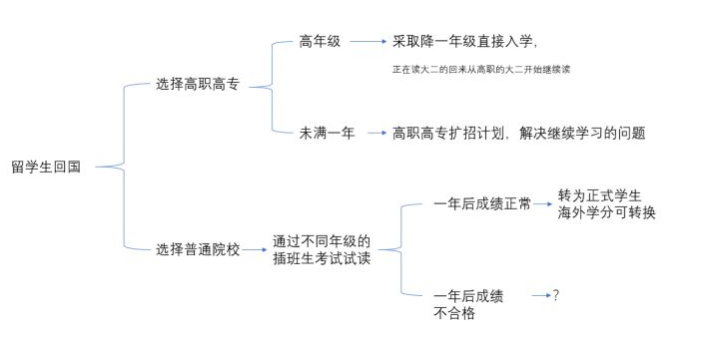一是全面开放高职高专学校,对于高年级学生可采取降一年级直接入学,进入相关专业的办法。未满1年的归国留学生,可以通过高职高专扩招计划,解决继续学习的问题。