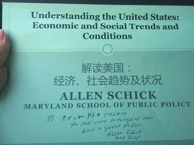 艾伦教授是马里兰大学资深的奠基者之一,八十岁高龄的老爷爷专程为我们在周末(也是母亲节)讲了一堂经济课。题目很大:解读美国,经济、社会趋势及状况。我本来以为是泛泛的讲演,没想到老人家准备了非常详实的数据和资料,也深深感受到犹太人看经济眼光的无比独到!更意外的是,因为一个问题比较深入,老教授特别的宣称:这是一个PH.D的问题,如果你还不是PH.D,那我们可以现场给你授予一个!课后老人家还特别在讲义中给手书立字为证。