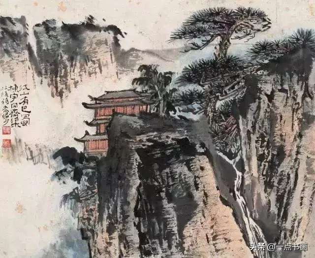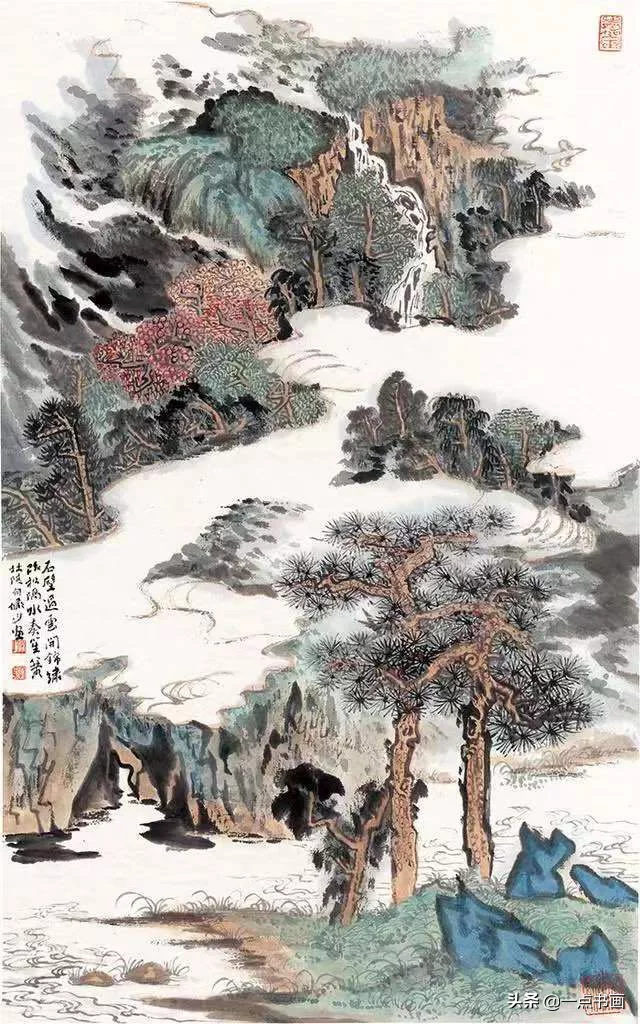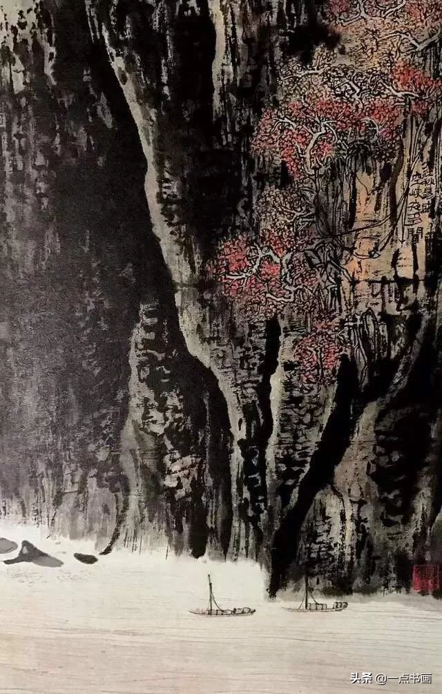 在适当的地方,一处或几处用上泼墨法,在干笔淡墨之中,镶上几块墨气淋漓的泼墨,可以使通幅神气更加饱满。或者觉到在这一部分全用干笔淡墨,精神不够,可用浓湿墨顺着干笔的势道,略略加上几笔点或短画,以提神贯气。这也叫[破],破者破其平,所以淡墨用浓墨破,干墨用湿墨破,一个目的就是让画面不平有层次。因之泼墨惜墨可以穿插互用。