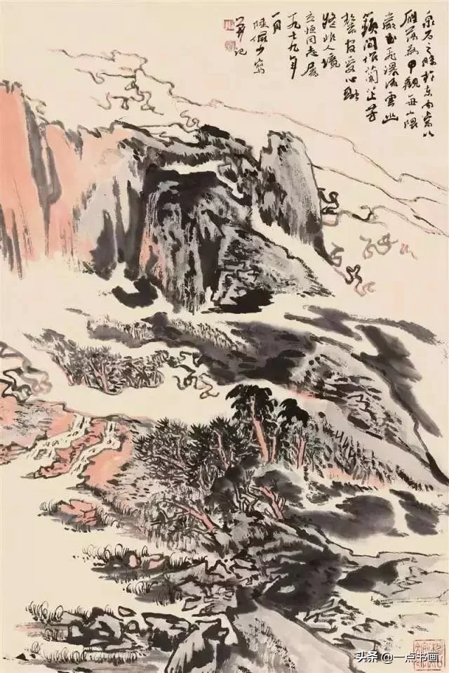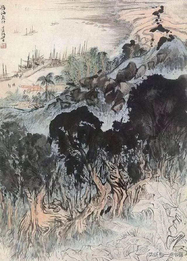元.黄子久称“作画用墨最难,但先用淡墨,积至可观处,然后用焦墨、浓墨,分出畦径远近,故在生纸上有许多滋润处,李成惜墨如金是也"。这段话对惜墨法来说是不错的,但不能一概如此。如泼墨法以及惜墨法中山石露出积角处,空出口子,必须上手即用焦墨浓墨,生辣几笔,是见精神处。不能由淡入浓,以致模糊了笔墨痕迹,只有早浓墨旁边渐淡处,层层加浓,不失生辣,又见浑厚,黄子久所说用墨最难,实则这生辣几笔,虽是用墨,主要是用笔。必须见笔迹,做到沉着痛快,用笔不好,效果全失。
