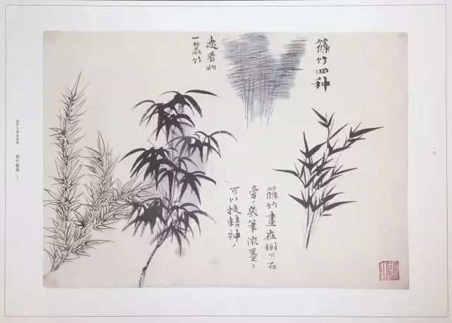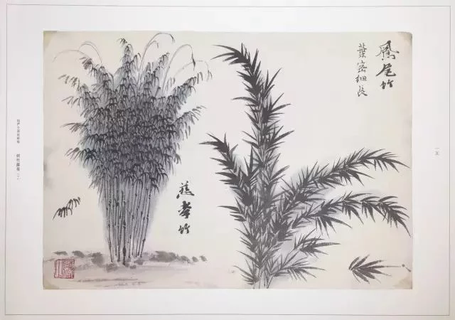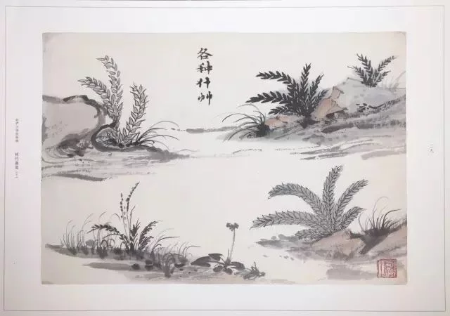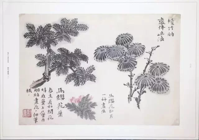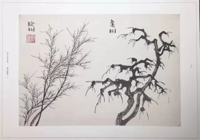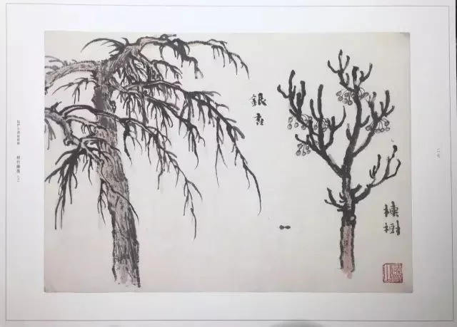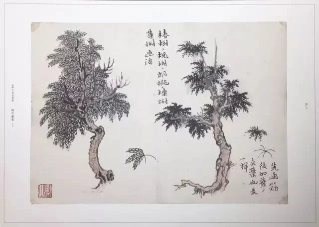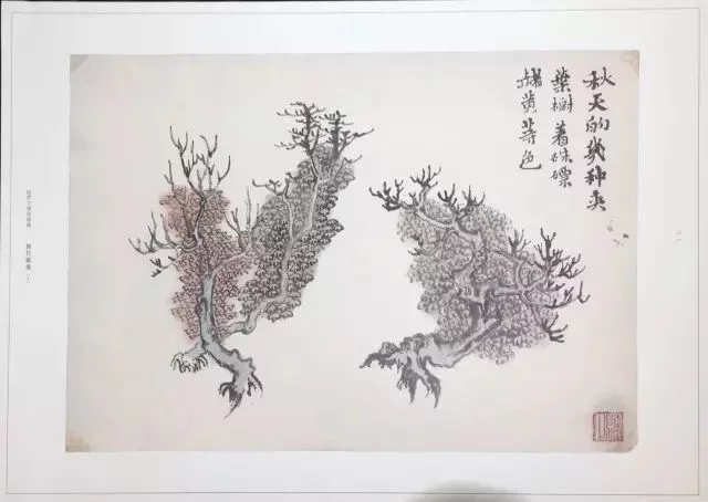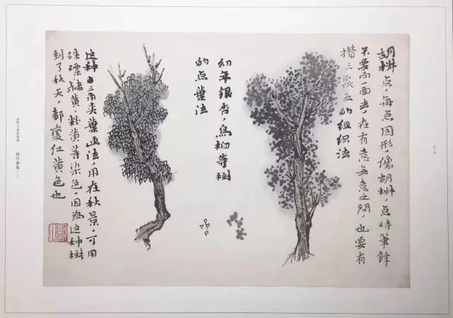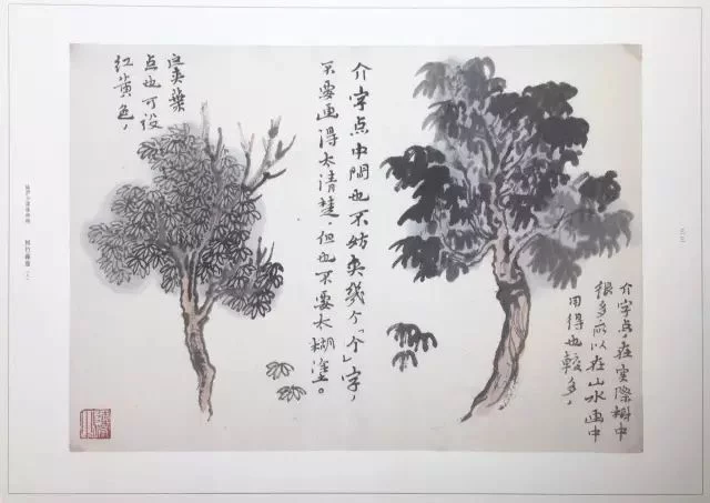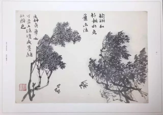 榆树和朴树的点叶画法。 这种夹叶,也可染上朱磦或墨赭的颜色。