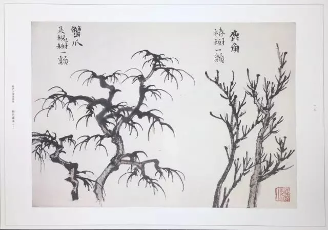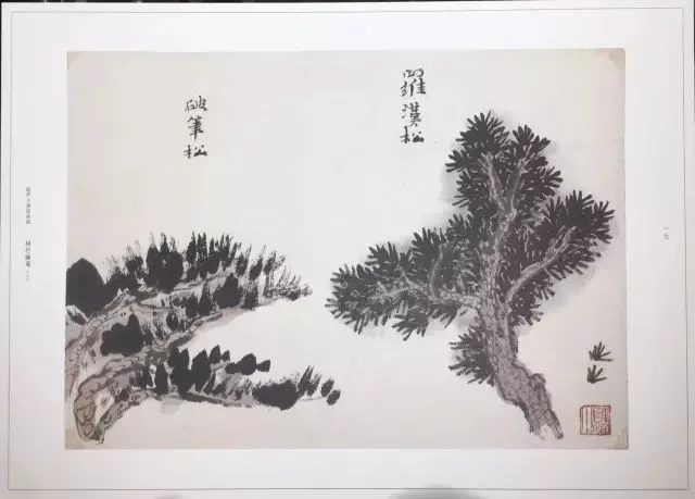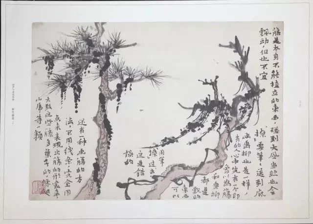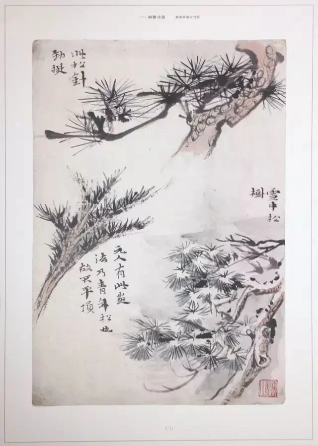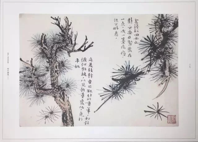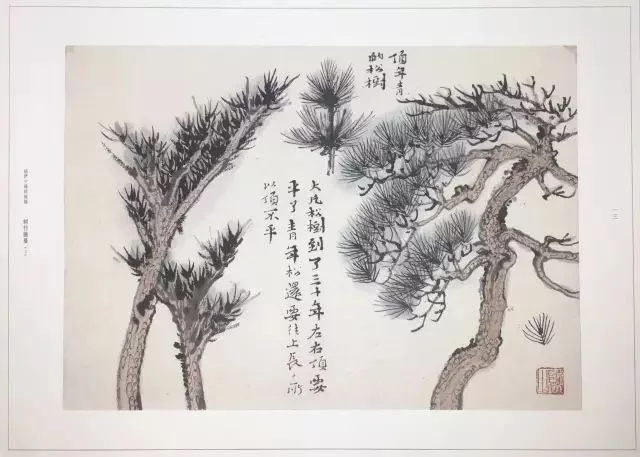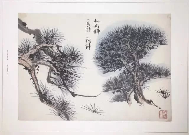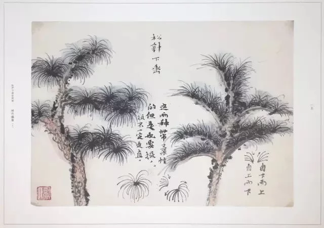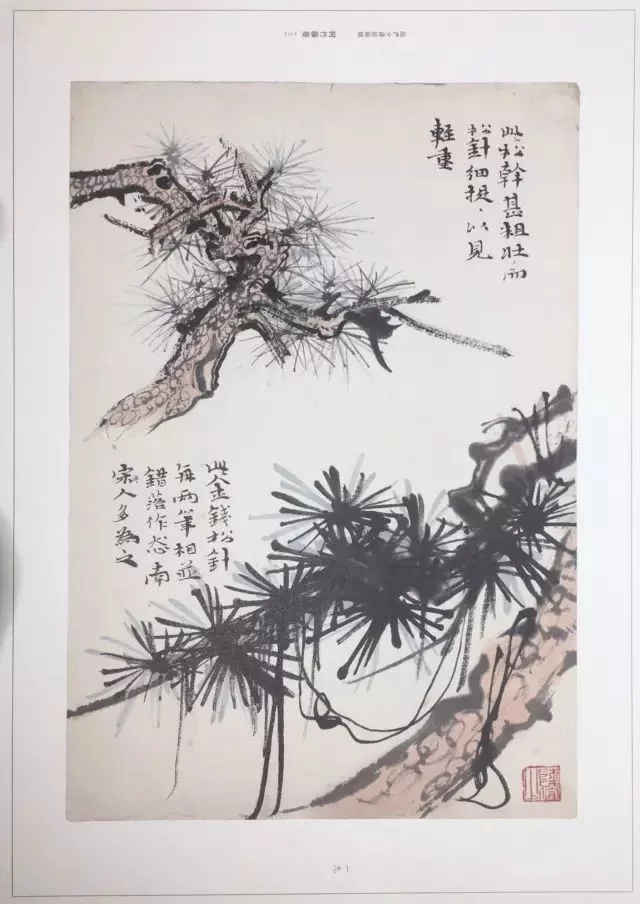 此松干甚粗壮,而松针细挺,以见轻重。 此金钱松针每两笔相并,错落作态, 南宋人多为之。