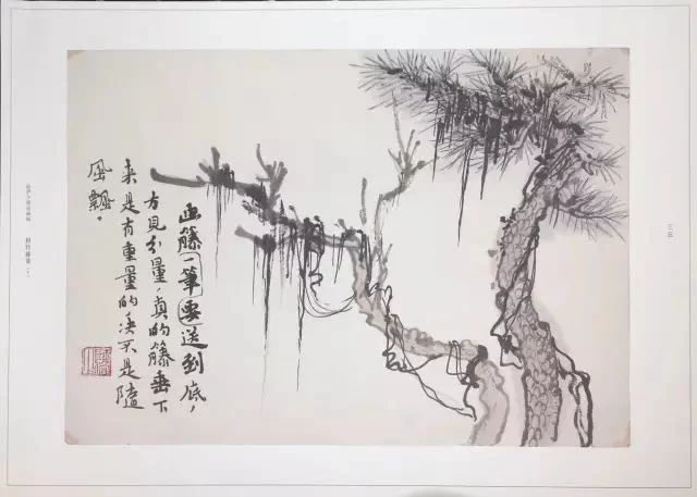 金钱松四面出针、不要紧聚在一点,成一墨疙瘩很不好看。 这是枝干,用粗壮的重笔,松针纤细劲挺,以见轻重变化,免于平板。