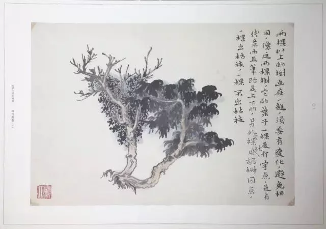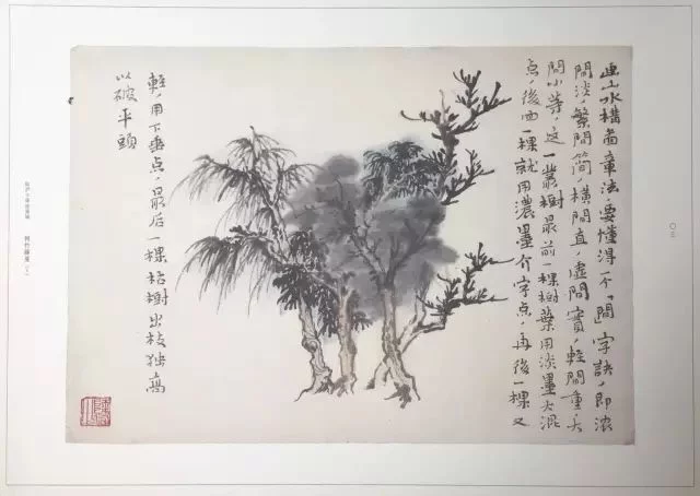 后面一棵就用浓墨介字点,再后一棵又轻, 用下垂点,最后一棵枯树出枝独高, 以破平头。