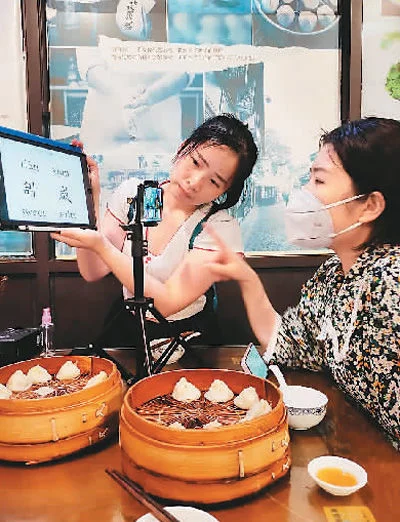 老师们带着学生通过直播镜头观看南翔小笼制作过程。