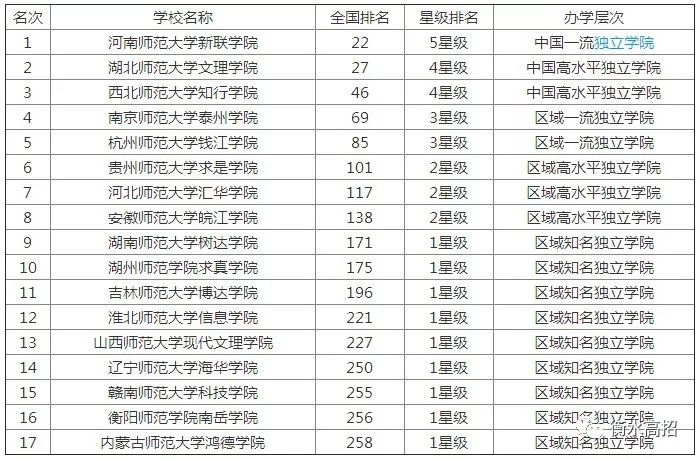 五 独立师范院校17所:河北师范大学汇华学院、河南师范大学新联学院、衡阳师范学院南岳学院、辽宁师范大学海华学院、杭州师范大学钱江学院、湖南师范大学树达学院等
