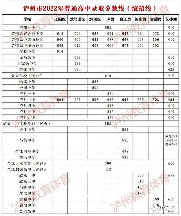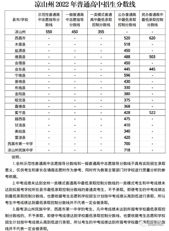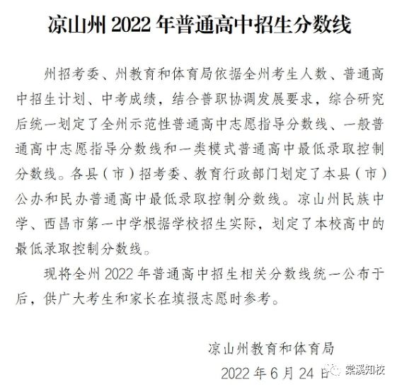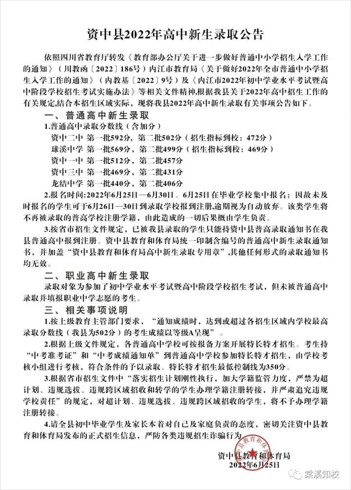 一、普通高中新生录取 1.普通高中录取分数线(含加分) 资中二中第一批592分,第二批502分(招生指标到校:472分) 球溪中学第一批569分,第二批499分(招生指标到校:469分) 资中一中第一批512分,第二批457分 资中三中第一批469分,第二批431分 龙结中学第一批440分,第二批406分 2.报名时间:2022年6月25日—6月30日。6月25日在毕业学校集中报名;因故未及时报名的学生可于6月26日—30日到录取学校报到注册,逾期视为自动放弃。该类学生将不再被录取的普高学校注册学籍,由此造成的一切后果概由学生负责。 3.按省市招生文件规定,已被我县录取的学生只能持资中县普高录取通知书在我县普通高中报到注册。资中县教育和体育局统一印制含编号的普通高中新生录取通知书,并加盖“资中县教育和体育局高中新生录取专用章”,其他任何形式的录取通知书均无效。 二、职业高中新生录取 录取对象为参加了初中学业水平考试暨高中阶段学校招生考试,但未被普通高中录取并填报职业中学志愿的考生。 三、相关事项说明 1.按上级教育主管部门要求,“通知成绩时,达到或超过各招生区域内学校最高录取分数线(我县为502分)的考生成绩以等级A呈现”。 2.根据上级文件规定,各普通高中学校可按报备方案开展特长特才招生。考生持“中考准考证”和“中考成绩通知单”到普通高中学校参加特长特才招生,由学校考核小组进行考核,符合条件的予以录取。特长特才招生最低控制线为350分。 3.根据省市招生文件中“落实招生计划刚性执行,加大学籍监管力度,严禁为超计划、违规选拔、违规跨区域招收和转学的学生办理学籍注册转接,并严肃追究违规学校责任”的规定,对超计划、违规选拔、违规跨区域招收的学生,将不予办理学籍注册转接。 4.请全县初中毕业学生及家长本着对自己及家庭负责的态度,密切关注资中县教育和体育局发布的正式招生信息,严防各类违规招生诈骗行为。