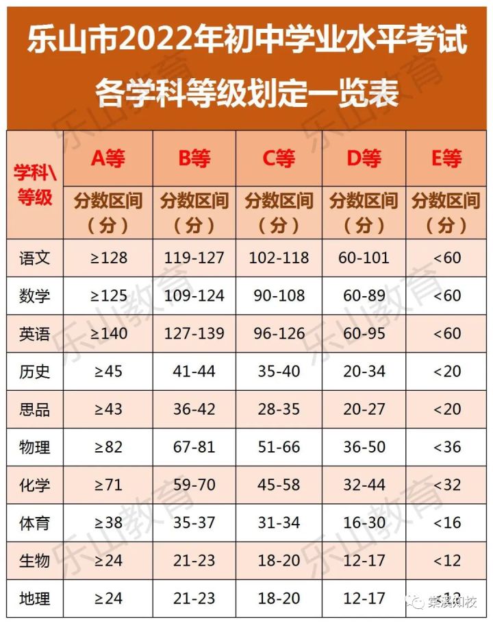 2020年起,乐山市中考各考试科目成绩以等级形式呈现,高中阶段学校招生录取则按照学生中考分数录取。2022年,乐山市中考命题按照“双减”政策要求,紧扣新课程标准,体现学科育人价值,中考难度系数控制在0.6,逐渐向国家0.7的标准靠近(难度系数越小考题越难)。为利于考生更好地自我评价,现将中考各学科成绩等级划定分数区间公布如下: