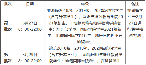 2.市外低风险地区的渝籍学生于2021年8月14日前返渝,抵渝后第一时间就近做1次核酸检测,核酸检测结果无异常应继续做好14天自我健康监测和管理后,于2021年8月28日-8月29日返校报到。