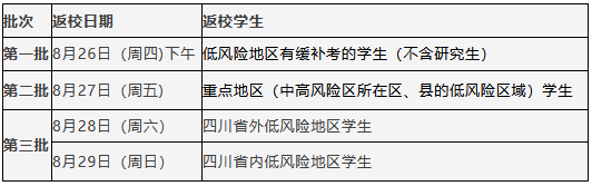 四川外国语大学国内低风险地区学生,遵循“分批错峰”的基本原则返校,其报到批次如下: