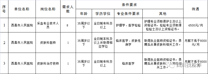 因工作需要,经医院研究决定,拟面向社会公开招聘卫生专业技术人员: 一、招聘岗位及名额 详见附件(附件1)。 二、招聘条件 1.热爱祖国,拥护党的路线、方针、政策,遵纪守法,爱岗敬业,无违法犯罪及不良诚信记录。 2.具有普通高等院校相关专业毕业证书。 3.年龄35周岁及以下(1987年7月20日以后出生)。 4.身体健康,无专业限制性疾病。 5.取得相关专业从业资格证书。 三、报名时间及方式 1.报名时间:即日起至2022年7月25日下午17:00,未按时间规定报名的不予受理。 2.报名需提供的材料:《西昌市人民医院公开招聘卫生专业技术人员登记表》(附件2)、《身份证》、《毕业证》、《学位证》、《教育部学历电子注册备案表》、相关专业从业资格证书原件及复印件。 3.报名方式:考生将报名材料以附件形式发送至医院邮箱:xichangshirmyy@163.com,邮件标题为“考生姓名+岗位名称”。 四、考试时间及方式 1.考试时间:待通知 2.考试方式:待定 五、待遇 执行医院临聘人员工资福利待遇,购买五险一金。 六、报名咨询及联系方式 部门:人事科 电话:0834-2176700 请参加报名的考生报名后加入下图QQ群,招聘相关事宜将在群内通知。