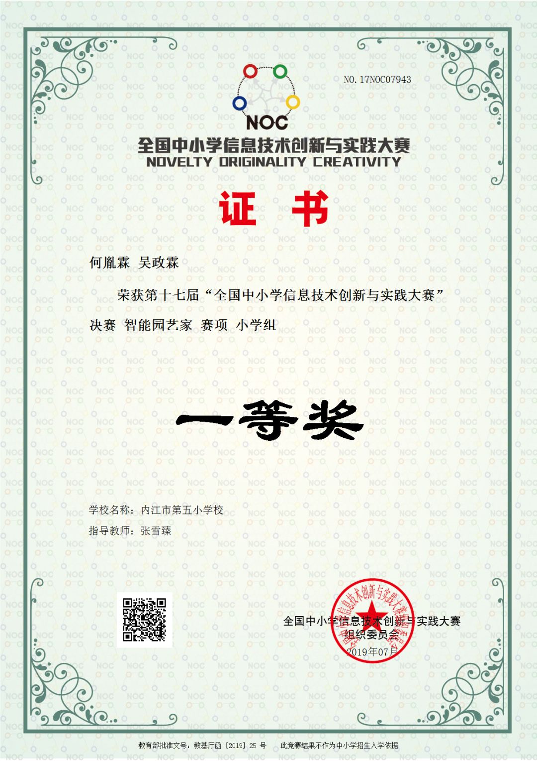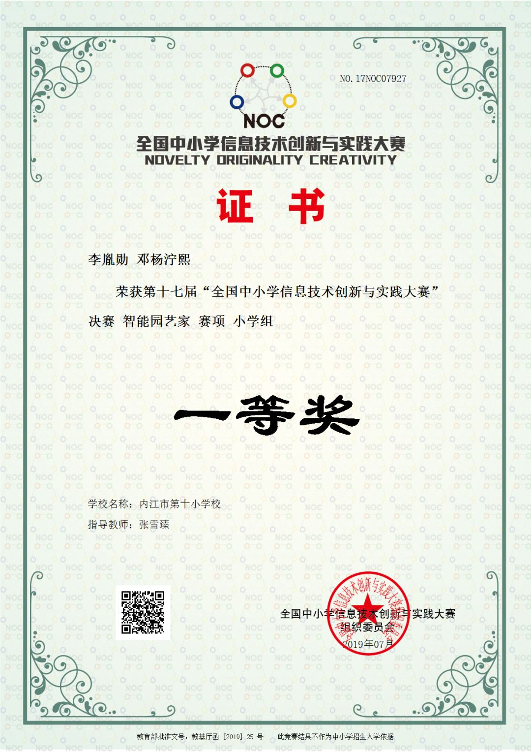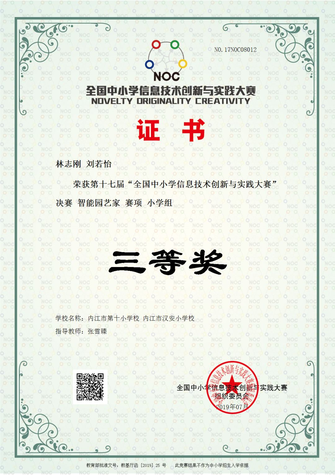 ■ 2019年8月,组织6名小学员参加NOC比赛(全国中小学信息技术创新与实践大赛),获得全国三等奖1个、全国一等奖2个。