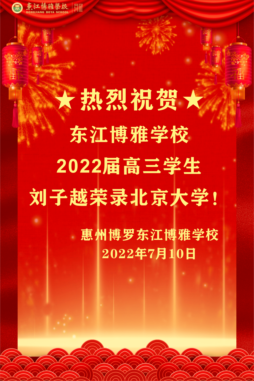 原标题:特大喜讯 | 博罗县东江博雅学校刘子越同学被北京大学录取!