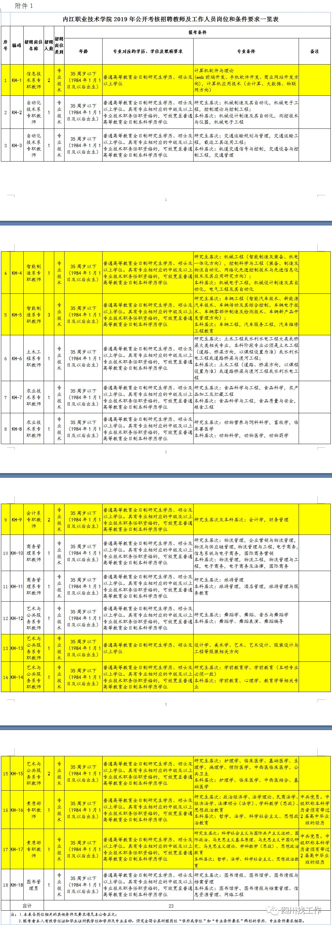 1.内江职业技术学院2019年公开考核招聘教师及工作人员岗位和条件要求一览表