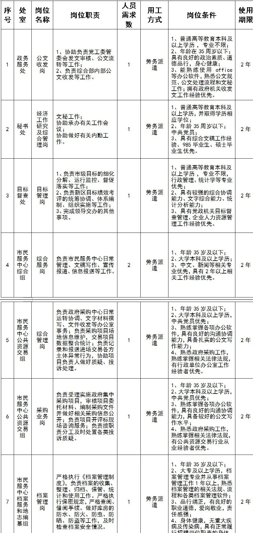 一、招聘对象及岗位人数(一)招聘对象符合招聘资格条件的社会在职、非在职人员。(二)招聘岗位、人数详见附件《成都东部新区综合部2022年第二批次公开招聘编外人员岗位表》。二、薪资待遇8-10万元/年(含单位及个人“五险一金”缴纳金额),实际薪资根据学历、工作年限确定,以合同签订为准。三、招聘资格条件(一)应聘人员必须具备下列基本条件1.拥护党的路线方针政策,遵纪守法、品行端正、爱岗敬业。2.具有正常履职的工作能力和身体条件。3.招聘岗位所规定的其他条件(详见附件)。应聘人员必须在截至报名前取得招聘岗位要求的毕业证书、学位证书及其他相关证书,否则不予聘用或不予进入下一招聘环节,后果及责任由本人自负。(二)有下列情况之一者,不得报考1.因犯罪受过刑事处罚的。2.被开除中国共产党党籍或公职的。3.受处分尚未解除或有违法、违纪行为正在接受审查的。4.被依法列为失信联合惩戒对象的。5.其他法律规定不得被聘用的情形。 四、招聘流程(一)发布公告四川人才网、四川招聘网、四川人才微信公众号、全盛人才微信公众号。(二)应聘报名应聘人员报名前务必认真阅读本公告及招聘要求等信息,根据本人学历、工作经验等实际情况,按照招聘资格条件与自我条件一致的原则报名。1.报名时间2022年8月5日至2022年8月10日2.报名方式报名均通过电子邮件形式发送至招聘邮箱,简历接收邮箱:qsrclzy0225@163.com,邮件请以“应聘岗位+应聘人姓名”命名,各类报名所需资料均以附件形式(压缩包)发送,邮件大小请勿超过10M。3.填报信息每人限报一个岗位,准确完整填写《应聘人员报名表》,采用其他格式表格填写的视为无效;因应聘人员个人原因造成的错误,或不完整填写报名表的,后果及责任由本人自负。对提供虚假报名材料的,一经查实,即取消应聘资格。(三)简历筛选、资格复审及考试1.简历筛选根据应聘人员基本情况进行简历筛选,按照同一招聘岗位招聘人数1:10的比例择优筛选进入笔试,达不到上述比例的岗位,以实际符合招聘资格条件人数为准。2.笔试(1)笔试内容:《综合能力测试》,内容包括公共基础知识、职业能力倾向测试。(2)笔试时间、地点:暂定2022年8月13日(周六),具体时间、地点以届时准考证信息为准。因考生未能及时了解相关公告等个人原因导致缺席的,后果及责任由本人自负。(3)开考比例:同一岗位的招聘人数与通过资格初审人数的比例原则上不低于1:3方可开考,达不到开考比例的,可在其他岗位报考人员同意后进行综合调剂。(4)笔试成绩:满分100分。3.资格复审进入资格复审人员按照同一招聘岗位人数1:5的比例,根据笔试成绩从高分到低分依次确定(如进入资格复审人员最后一名笔试成绩出现并列,一并进入),应聘人员未按要求参加资格复审、资格复审不合格或本人主动放弃的,可根据笔试成绩从高分到低分依次递补。资格复审时应聘人员应交验身份证、毕业证、学位证等与招聘资格条件相关的证件、证明材料原件及复印件,审查合格者进入面试环节,并打印面试准考证。4.面试(1)面试方式:综合面试,满分100分。(2)面试时间、地点:以通知为准。(3)开考比例:同一招聘岗位的招聘人数与实际参加面试人数的比例原则上不低于1:2方可开考,达不到开考比例的,相应调减该岗位招聘人数直至取消该招聘岗位;确属急需紧缺岗位,可降低至1:1开考并以最低合格线为基准。5.总成绩(1)本次公开招聘采取综合淘汰的考核方式进行。总成绩满分100分,总成绩=笔试成绩*50%+面试成绩*50%。(2)按总成绩不低于60分,从高分到低分的顺序,及1:1招录比例确定进入体检环节人员名单。如符合条件人数低于计划招录人数,则根据实际符合条件人数确定进入体检环节人员。(3)如笔试总成绩并列,以面试成绩高者优先;如笔试总成绩和面试成绩均并列,以面试中专业能力要素成绩高者优先。(4)如经综合考核,岗位报考者均未达到所报考岗位职责胜任要求的(原则上总成绩低于60分),取消该岗位此次招聘。(四)体检进入体检人员按照同一岗位招聘人数1:1的比例,在最低合格线上根据应聘人员总成绩从高分到低分依次确定,名单与最终成绩一并公布。如同一岗位最终成绩达到最低合格线以上人数不足招聘人数,可根据空额数并按照同样规则组织递补资格复审和面试;仍无合格人选的,相应调减该岗位招聘人数直至取消该招聘岗位。进入体检人员须根据通知前往指定医院进行体检。体检标准参照《公务员录用体检通用标准(试行)》执行。体检所产生的一切费用由进入体检人员本人承担,体检时间、地点另行通知。 初次体检不合格的可在接到初次体检结果三日内申请复检一次并以复检结果为准。进入体检人员未按要求参加体检、体检不合格及本人主动放弃的,取消进入下一招聘环节的资格,由此产生的缺额,可根据同一岗位最终成绩,在最低合格线以上从高分到低分依次等额递补;如不递补或无递补人选,相应调减该岗位招聘人数直至取消该招聘岗位。(五)考察对体检合格的报考人员进行具体考察,考察内容包括违法犯罪情况、政治思想、职业道德、工作表现、工作实绩等情况,同时需对报考资格进行再次复查。对考察中发现有不符合录用条件或本人放弃而出现缺额的,招录单位可酌情递补。(六)聘用考察通过后,与劳务派遣公司签定合同,派遣至用人单位工作。