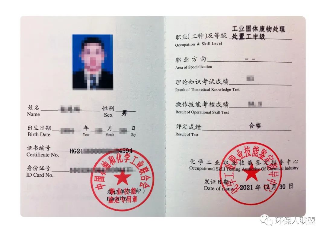 考核鉴定通过化学工业职业技能鉴定指导中心颁发《工业固体废物处理处置工》职业技能等级证书
