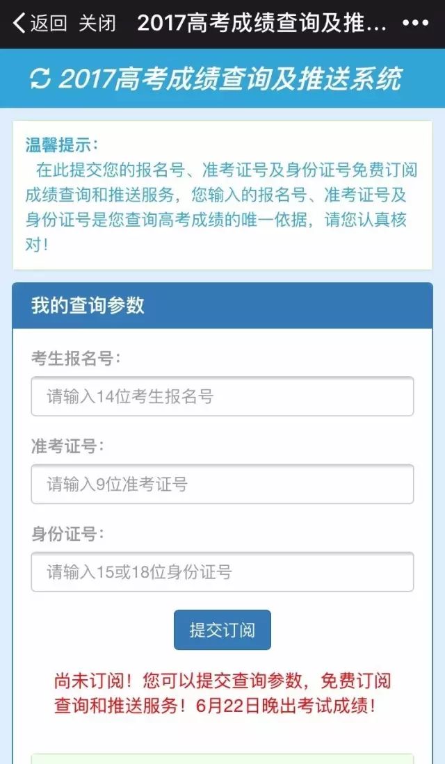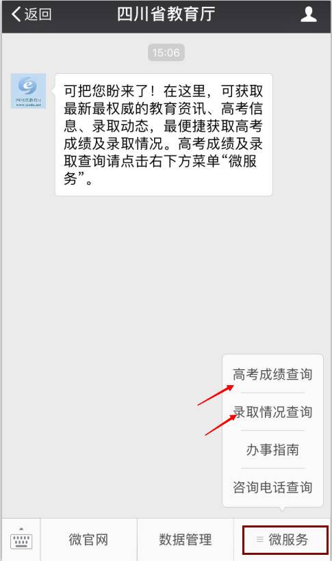 考生通过添加微信公众号“四川省教育厅”(微信号:scsjyt),点击下方菜单“微服务”进入高考查询成绩和录取情况查询界面,按照提示输入考生报名号、准考证号、身份证号完成订阅。届时,订阅用户将在第一时间收到由平台主动发送的高考成绩。