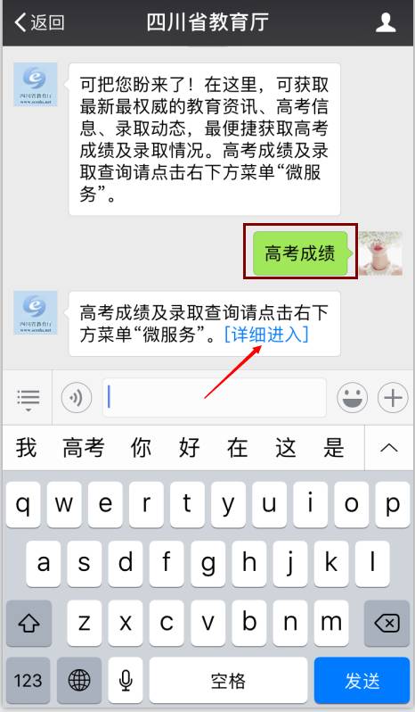 ✿ 也可在对话框中输入“高考成绩”进入成绩订阅界面,进入订阅界面后按照提示输入考生报名号、准考证号、身份证号完成成绩订阅。