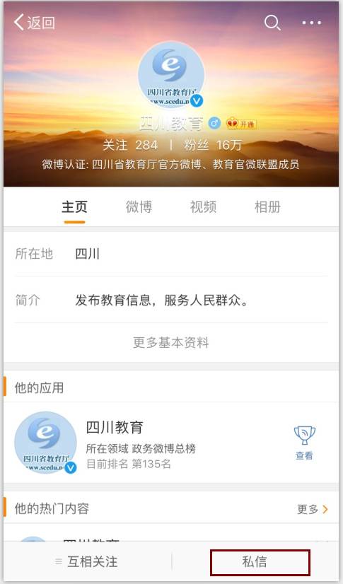 微博用户关注“四川教育”新浪微博,点击菜单“私信”,通过对话框下方自定义菜单“成绩查询或录取查询”即可进入到相应的查询页面,考生凭考生报名号、准考证号、身份证号查询高考成绩及录取情况。