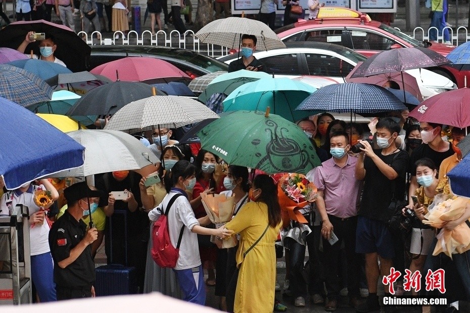 6月9日,广东省广州市第十六中学考点外,家长等待考生结束最后一科考试。 中新社记者 陈楚红 摄