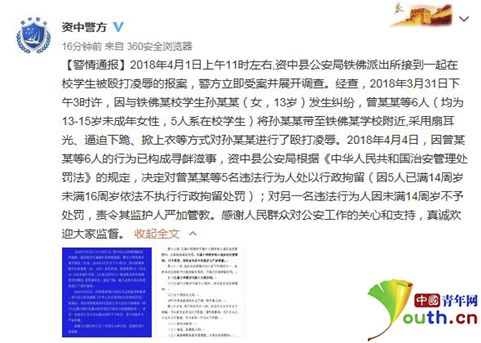 针对此事,四川省内江市资中县公安局官方微博4月6日晚发布警情通报称,经查,3月31日下午3时许,因与铁佛某校学生孙某某(女,13岁)发生纠纷,曾某某等6人(均为13-15岁未成年女性,5人系在校学生)将孙某某带至铁佛某学校附近,采用扇耳光、逼迫下跪、掀上衣等方式对孙某某进行了殴打凌辱。