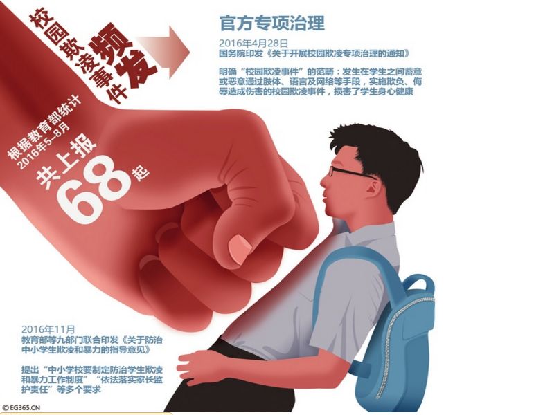 “及时有效地矫正校园欺凌,否则有可能会换来更严重的报复。”全国政协委员、北京四中校长马景林认为,对于校园欺凌还是要分类别讨论。像淘气、恶作剧式的问题,要通过教育的方式来解决;而性质恶劣的,则要通过法律手段去解决。