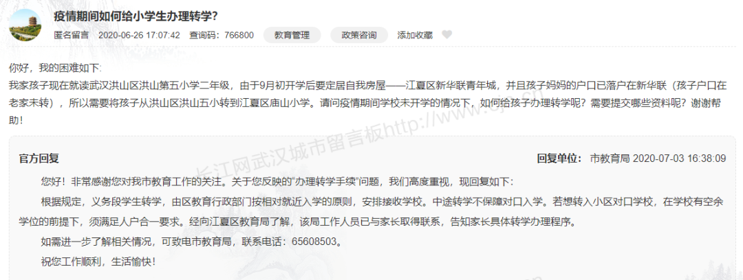 有家长在城市留言板留言:我家孩子现在就读武汉洪山区洪山第五小学二年级,由于9月初开学后要定居自我房屋——江夏区新华联青年城,并且孩子妈妈的户口已落户在新华联(孩子户口在老家未转),所以需要将孩子从洪山区洪山五小转到江夏区庙山小学。请问疫情期间学校未开学的情况下,如何给孩子办理转学呢?需要提交哪些资料呢?