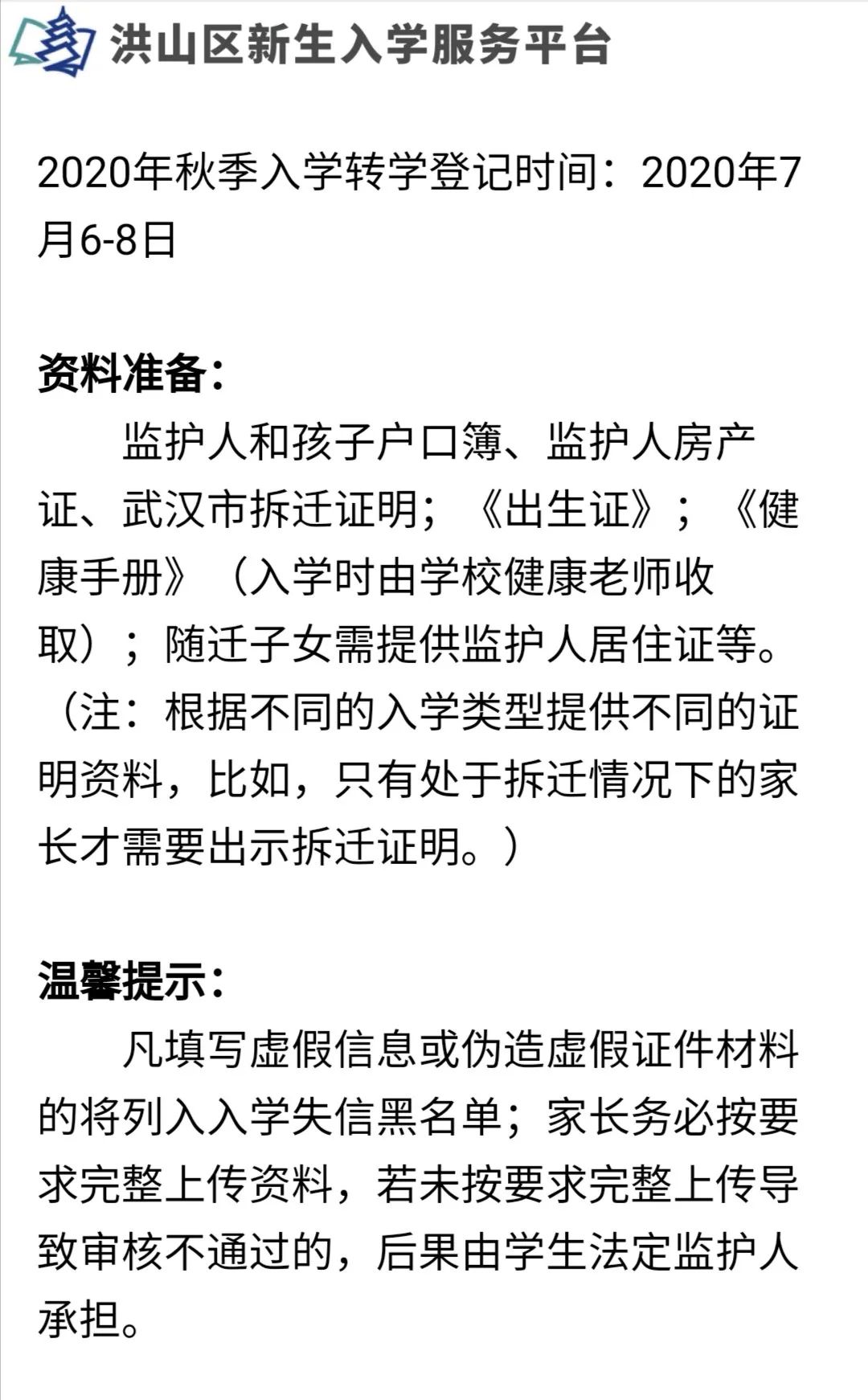 凡符合以下条件之一者,具备我区转学(入学)资格:1.学生户籍属于武汉市东西湖区。2.学生法定监护人拥有武汉市东西湖区房产。3.学生户籍(出生上户)和法定监护人户籍与祖父母(外祖父母)同户,祖父母(外祖父母)拥有东西湖区房产,且学生法定监护人名下无房产(法定监护人名下无房产需到“市民之家”出具无房证明)。4.学生法定监护人持有效期内的东西湖区《武汉市居住证》。5.已办理户籍由市外迁入我区留汉创业就业的大学生子女。二、资料准备