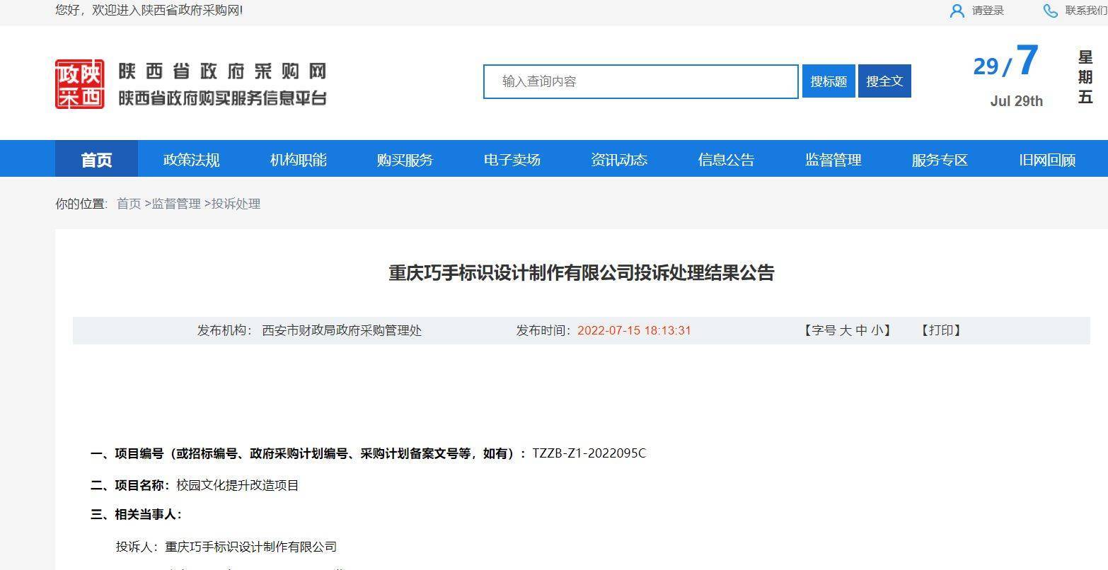 8.1日讯,近日西安市财政局政府采购管理处发布关于西安市工读学校校园文化提升改造项目投诉处理结果公告信息。