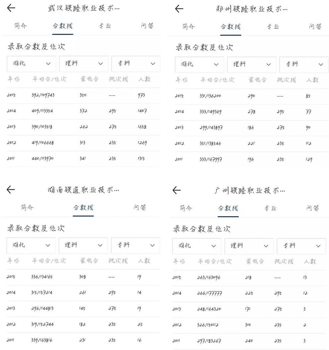 铁路院校的就业形势近年来,铁路专科院校就业形势相对不错,各大专院校风生水起,炙手可热。虽说是大专院校,可凭借和铁路“双主体”培养的优势,因此在录取分数线上,体现出了比非铁路大专院校稍高的要求。以武汉铁路职业技术学院为例,近几年,其对湖北省内分数线基本与当年三本院校持平,相关等热门专业分数线已高出三本分数线。当然,本科院校毕业以后就业于铁路系统的也会有一个就比较好的发展前景。