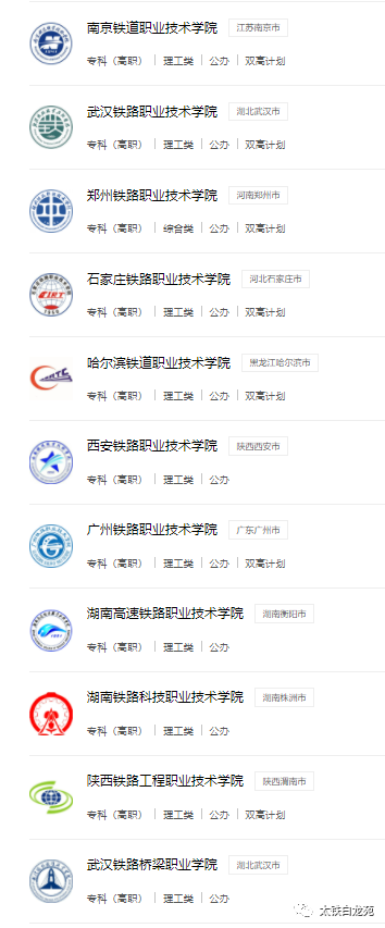 武汉铁路职业技术学院、湖南高速铁路职业技术学院、郑州铁路职业技术学院、石家庄铁路职业技术学院、南京铁道职业技术学院、哈尔滨铁道职业技术学院、西安铁路职业技术学院等