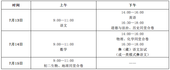 中考考试科目:语文、数学、英语(含听力)、物理(含实验操作)、化学(含实验操作)、道德与法治、历史、体育、彝(藏)语文加试(二类模式考生参加)、一类模式彝语文(一类模式考生参加);初二学业水平考试科目:生物、地理。