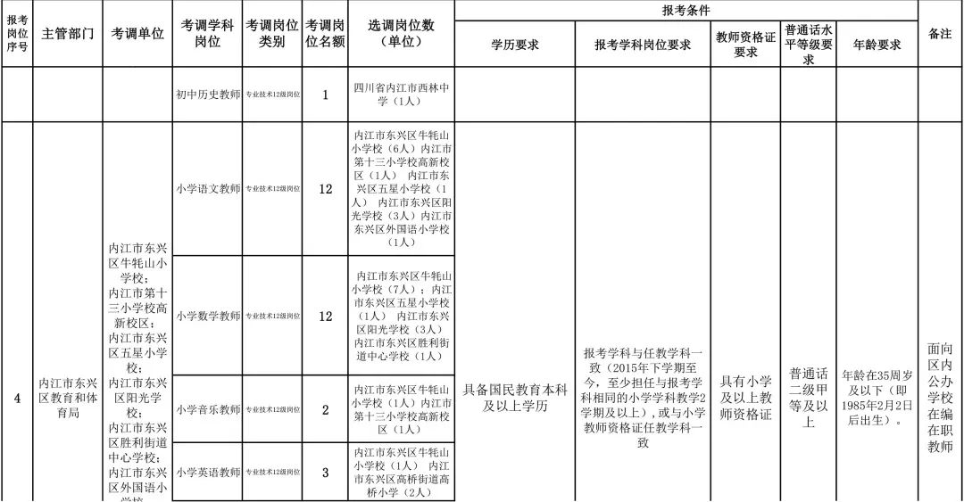 本次考调的内江三中、内江市东兴区机关幼儿园面向东兴区内外公办学校在编在职教师考调,其余学校面向东兴区内公办学校在编在职教师考调。