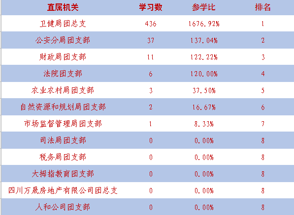 参学比为0的有税务局、大指拇教育、四川万晟地产有限公司、人和公司,需采取有力举措,加强组织力建设,有效提升引领力。