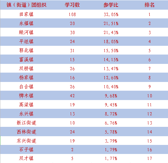 在参学比上,田家镇排名第一;参学比低于10%的有椑木镇、高梁镇、永兴镇、新江街道、西林街道、东兴街道、石子镇、双才镇,在接下来的学习中需要进一步努力,采取有力举措,加强组织力建设,有效提升引领力。