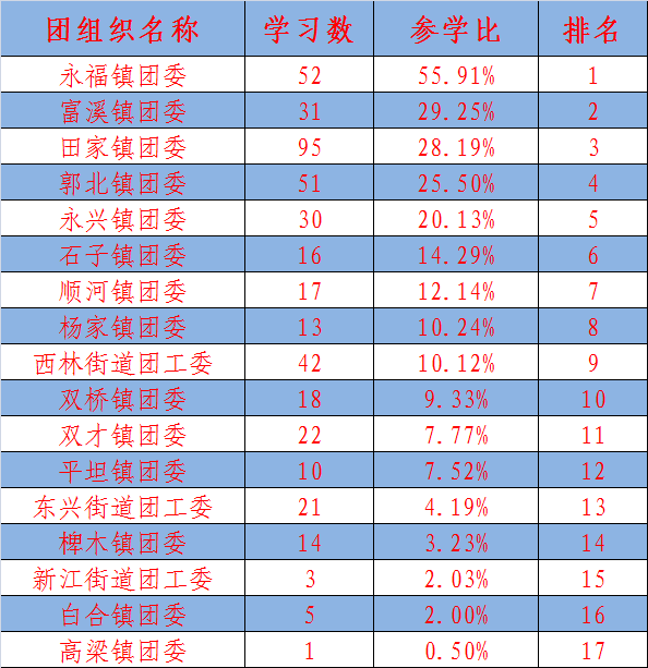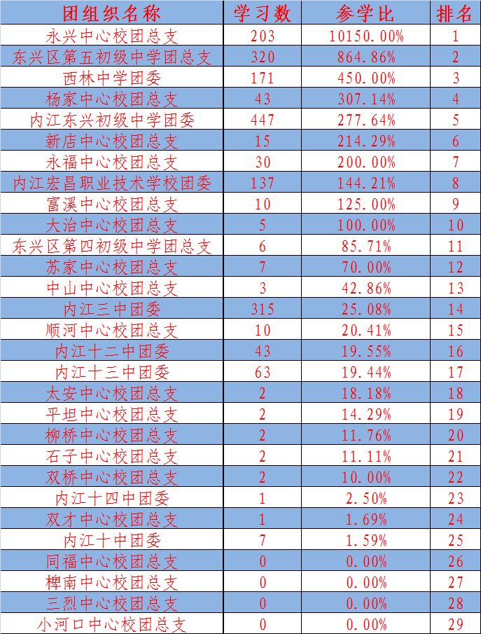 在参学比上,永兴中心校、东兴区第五初级中学、西林中学、杨家中心校、内江东兴初级中学、新店中心校、永福中心校、内江宏昌职业技术学校、富溪中心校、大治中心校位于学校排名前十名,提出表扬。内江三中学习人数虽然也有315人,但由于团员基数较大,参学比仅为25.08%,还需继续加油。参学比为0的同福中心校、椑南中心校、小河口中心校、三烈中心校等4所学校请引起高度重视,采取补救措施。