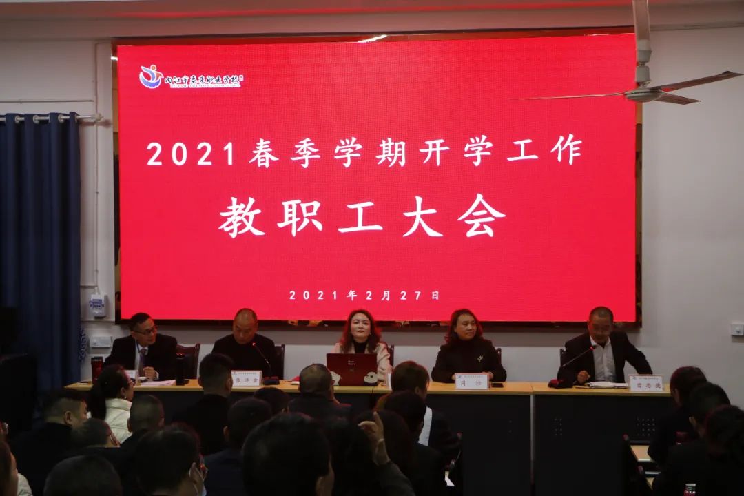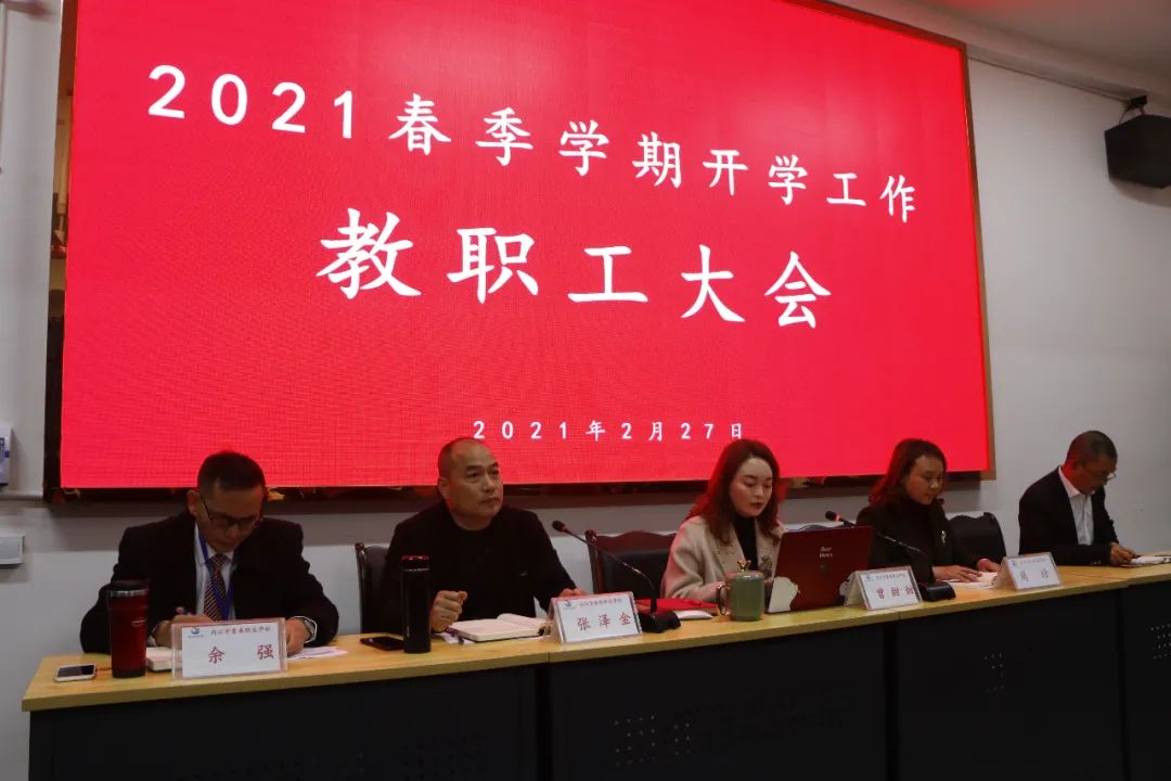 2月27日上午,内江市泰来职业学校2021新学期教职工大会在阶梯教室召开,会议由张泽金书记主持,学校全体教职工参加会议。