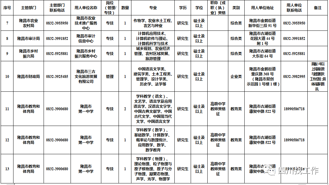 遂宁市安居区乡村振兴局拟面向社会公开招聘工作人员5名,现将有关事项公告如下:一、报名条件(一)基本条件1.具有中华人民共和国国籍,遵守《宪法》和法律;2.身体健康,具备正常履行职责的身体条件,具有良好的品行和职业道德;热爱乡村振兴工作,有爱心、耐心和责任心;3.大专及以上学历;有乡村振兴、规划设计工作经验或具有较强文字功底的优先;4.年龄在40周岁以下(1982年8月12日后出生),男女不限。(二)具有下列情形之一的,不能报名1.曾受过刑事处罚或被开除公职人员;2.在各级事业单位招聘考试中被认定有作弊行为的或有报考不诚信记录,且处理期未满的人员;3.法律、法规规定的其它不得聘用的情形。二、招聘程序(一)报名请于2022年8月20日前,将个人身份证复印件、学历证书、个人简历等资料发送至电子邮箱1550721232@qq.com。(二)面试我单位将对报名人员进行资格审查,并拟于8月25日对通过初审人员进行面试。(三)聘用入围人员实行合同制聘用,与我局合作的第三方劳务派遣公司签订《劳务合同书》。待遇参照安居区社会购买服务人员薪资待遇标准执行。联系人:赵主任,15982581044内江隆昌市2022年“隆昌英才”公开选聘活动公告