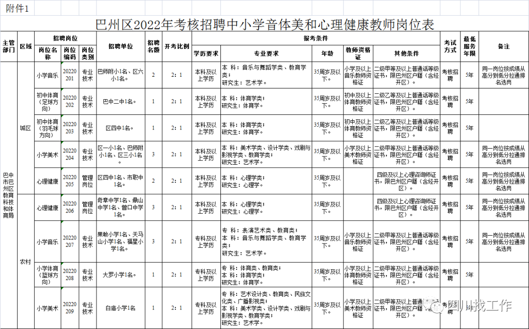 根据《事业单位人事管理条例》《四川省鼓励引导人才向基层流动十条措施》(川委办〔2019〕3号)、《中共巴中市巴州区委机构编制委员会关于下达2022年中小学教职工编制使用计划的通知》(巴区编委〔2022〕16号)等规定,结合我区学校教育教学工作实际,经区委、区人民政府同意,决定面向社会公开考核招聘一批公办中小学音体美和心理健康教师。现将有关事项公告如下:一、招聘原则坚持“公开、平等、竞争、择优”的原则。二、招聘单位及名额(一)招聘单位:巴中二中、区四中、市职中、区一小、巴师附小、区三小、区六小、奇章中学、鼎山中学、曾口中学、果敢小学、天马山小学、福星小学、大罗小学、白庙小学。 (二)招聘名额:17名。具体招聘岗位详见《巴中市巴州区2022年度公开考核招聘中小学音体美和心理健康教师岗位表》(以下简称《岗位表》,见附件1)。三、招聘范围及对象(一)招聘范围面向社会公开考核招聘,具有中华人民共和国国籍、符合报考基本条件的中国公民均可报名。(二)招聘对象符合招聘岗位应聘资格条件要求的,具有大专、本科及以上学历的应往届毕业生。四、应聘资格条件(一)应聘人员应同时具备的条件1.热爱社会主义祖国,拥护中华人民共和国宪法,拥护中国共产党,遵纪守法,品行端正,有良好的职业道德,爱岗敬业,事业心和责任感强;2.身体健康,具有正常履行招聘岗位职责的身体条件;3.报考音体美学科岗位须符合《中华人民共和国教师法》和《教师资格条例》规定的条件,具备岗位要求的教师资格证。暂未取得教师资格证书的人员须在报名资格审查时提供相应教师资格面试和普通话合格成绩证明,并在办理聘用手续前取得相应教师资格证书。在2021年及2022年中小学(含幼儿园、中等职业学校)教师资格考试中受疫情影响的考生(2021年及2022年中小学教师资格考试笔试成绩单或面试成绩单“受到疫情影响”栏标注为“是”),报名资格审查时教师资格不作为限制条件,如通过考核可以先上岗从事辅助性教育教学工作,并在聘用后的1年试用期内取得相应教师资格证,否则依法解除聘用合同;4.报考心理健康岗位须具有四级及以上心理咨询师证书;5.报考城区学校音体美学科岗位须具有本科及以上学历,报考农村学校音体美学科岗位须具有专科及以上学历,报考心理健康岗位须具有本科及以上学历;6.年龄在35周岁及以下(1986年8月20日及以后出生);7.符合招聘岗位确定的其他条件;8.在编在岗工作人员报考需经本人编制所在单位和主管部门批准同意。(二)有下列情况之一者,不得应聘1.曾受过刑事处罚的;2.曾被开除公职的;3.有违法、违纪行为正在接受审查的;涉嫌违法犯罪行为正在接受司法调查尚未作出结论的人员;4.党纪、政纪(务)处分尚在影响期内的;5.未达到政策规定最低服务年限的(截止到报名当天);6.不愿承诺单位约定的最低服务年限的(具体服务年限见《岗位表》);7.有其它违反国家法律、法规行为,不宜参加应聘的。五、报名及资格审查(一)报名1.报名时间:2022年8月20日9:00至12:00, 15:00至18:00。2.报名地点:巴中市巴州区教育科技和体育局8楼会议室。3.报名方式:现场报名。4.报名材料:①《巴州区2022年考核招聘中小学音体美和心理健康教师信息登记表》(见附件2)1份;②本人有效身份证原件,复印件1份;③毕业证、学位证、相应岗位教师资格证或心理咨询师证书原件,复印件各1份;④暂未取得教师资格证书人员和在2021年及2022年中小学教师资格考试中受疫情影响的考生,提供相应教师资格笔试、面试和普通话合格成绩证明;⑤在编在岗人员除上述资料外,还须提供报考前本人编制所在单位和主管部门出具的同意报考的书面证明(原件);⑥近期2寸正面免冠彩色照片3张。5.报名要求:报考者根据岗位要求、条件及有关规定和注意事项等内容,选择1个符合报名条件的岗位报名。(二)资格审查本次招聘工作由巴中市巴州区教育科技和体育局(以下简称区教科体局)、巴中市巴州区人力资源和社会保障局(以下简称区人社局)组织专人,按照规定对报考者相关证件的原件进行资格审查。报考者所提供的资格审查资料必须齐全且保证真实,资格审查工作人员将以考生现场提供的资料进行判定是否合格。资格审查贯穿整个招聘工作全过程,任何环节发现报考者不符合招聘资格条件或弄虚作假将随时取消招聘资格,已办理聘用手续的将解除聘用合同,所造成的一切后果由应聘人员本人承担。(三)开考比例及入围笔试1.报考人数与岗位招聘人数之比应不低于2:1,若达不到这一比例,按规定相应调减或者取消岗位计划。调减公告将在巴中市巴州区人民政府网站上公布。2.若报考人数与岗位招聘人数之比超过10:1,则先组织笔试。笔试内容为相应学科专业知识,满分为100分。根据笔试成绩从高分到低分,按笔试人数与岗位招聘数10:1的比例,确定进入面试人员,若招聘岗位最后一名笔试成绩相同的,一并进入面试。笔试成绩不计入总成绩。3.若需进行笔试,时间定于2022年8月25日。拟参加笔试考生详见《巴中市巴州区教育科技和体育局关于2022年度考核招聘中小学音体美和心理健康教师入围笔试的通知》,此通知将于8月22日在巴中市巴州区人民政府网站公布。4.笔试成绩将于笔试结束后的当日内,通过巴中市巴州区人民政府网站公布。对缺考、违纪、零分、无效等异