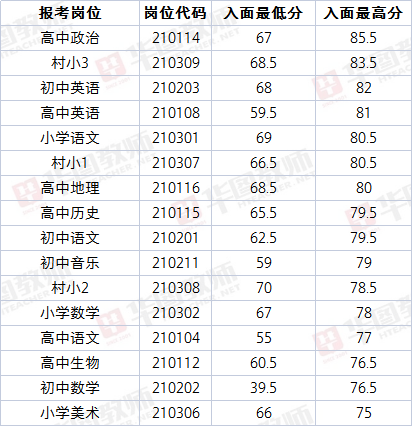 因安岳岗位较多,仅截取最高入面分75分以上岗位,安岳虽然也有高分85.5,但也有210202初中数学39.5;还有210204初中物理:最低入面分41.5;210209初中地理:最低入面分46;还有210117高中现代教育技术,最低入面分46.5,最高入面分61.5。