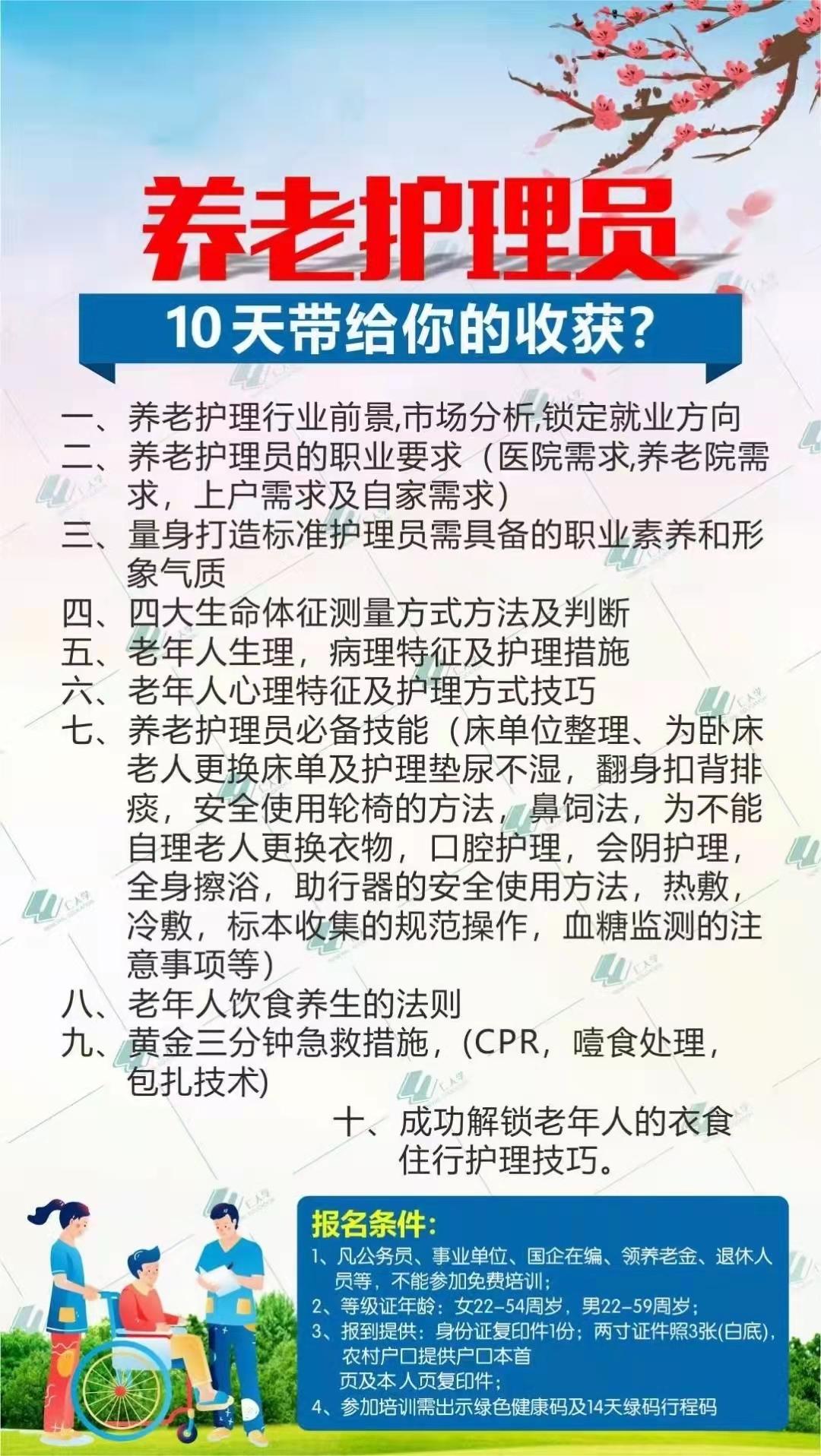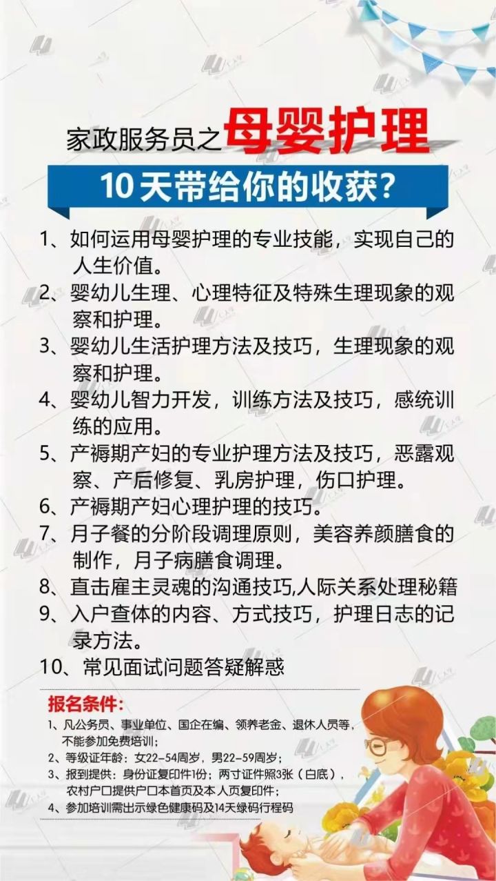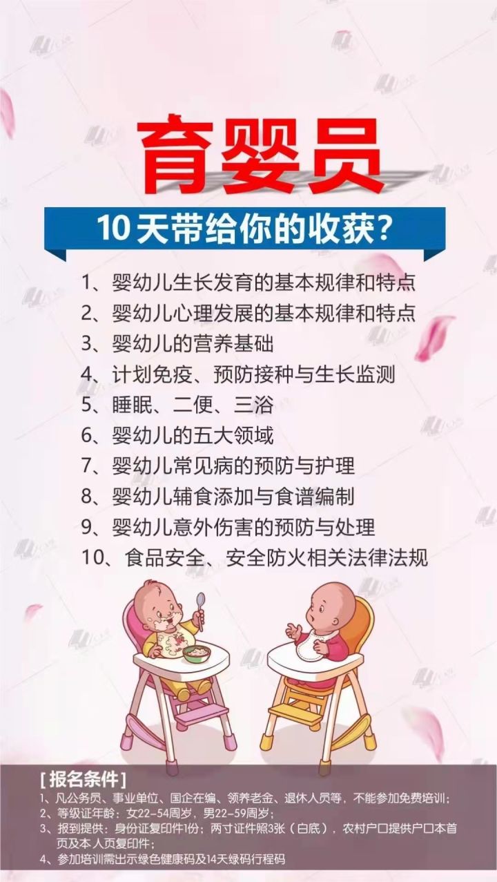 主推工种:育婴员、保育员、养老护理员、家政服务员、健康管理师、企业人力资源管理师、电子商务师、保健按摩师、健康照护师、中式烹调师;